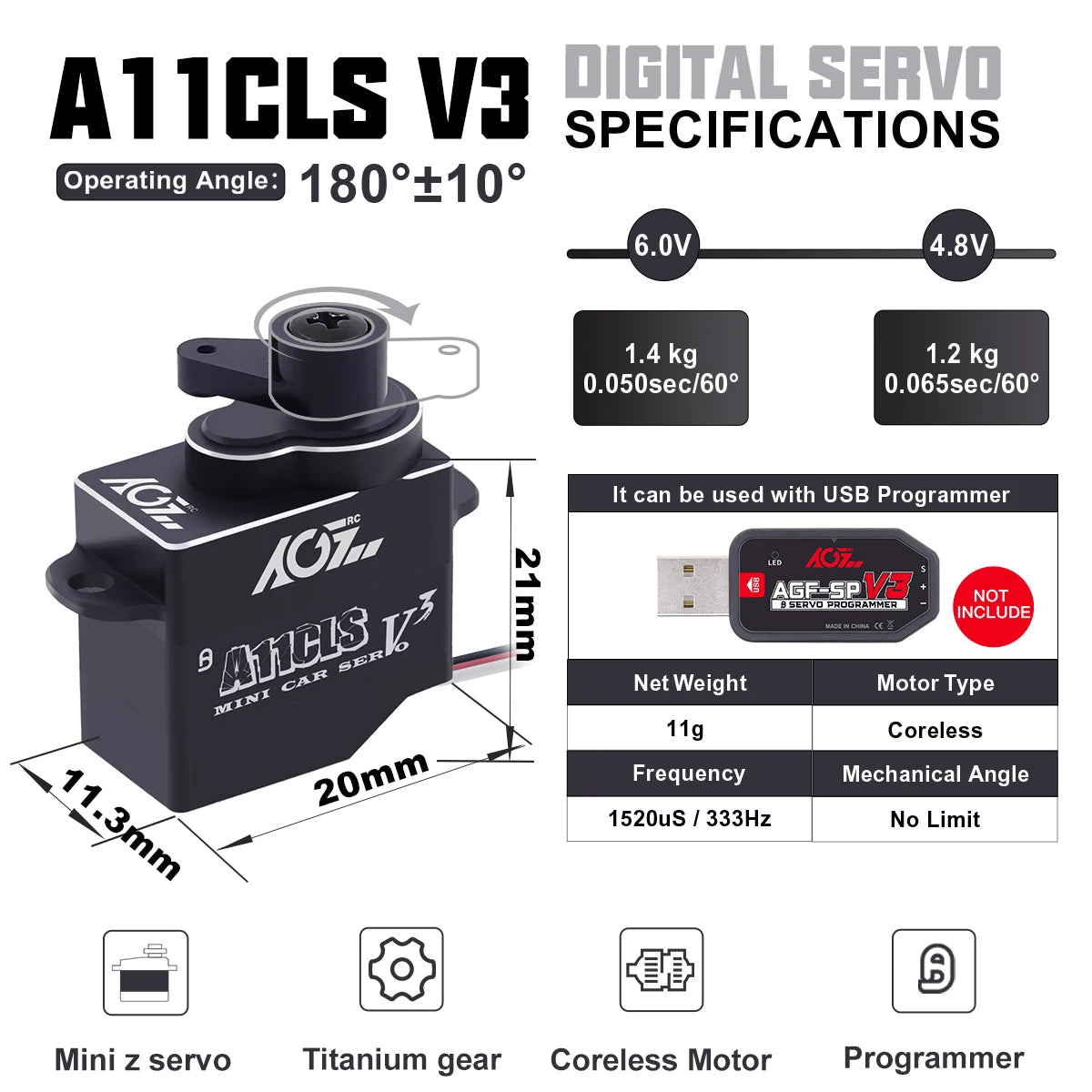 A11CLS V3 Control System Pulse width modulation control Refresh Rate 333Hz 2-22,3 16.35_ 4765 04 25T Neutral Position 1520uS Signal Mode Digital Dead band 3 uSec 1435 5165 Operating Voltage 4.8V 6.0V Operating Temperature -15C’_ +70C8 Bearing Double Ball Bearings Mechanical Angle No Limit Size 20*11.3*21mm Net Weight 11g Wire JRI JST1.5 8Omm 30AWG Operating Travel 180