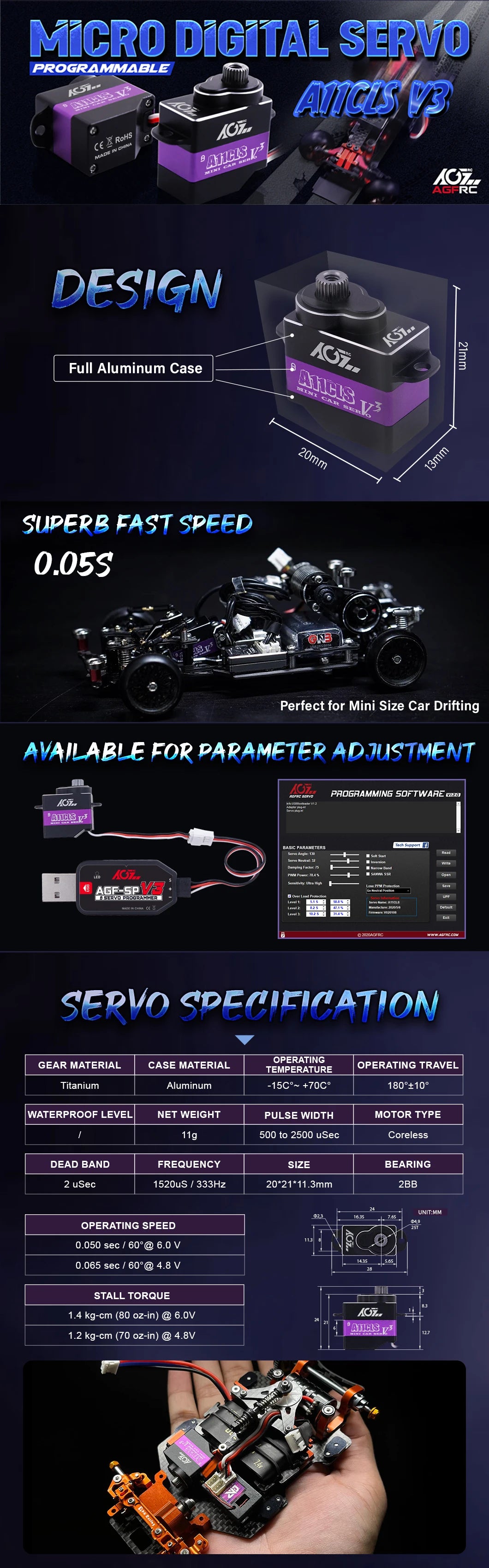 AGFrc A11CLS V3 Mini Z Scale Digital Programmable Servo. The use of high quality coreless motor, high accuracy titanium gear and 2 ball bearings, so that it working stable and smooth. It has programmable function which support to adjust the servo parameter as required. It is a great choice for 1/24, 1/28 scale mini Z cars who demand 0.065sec fast speed and 1.4 kg-cm high torque in an ultra-small size and light weight body.