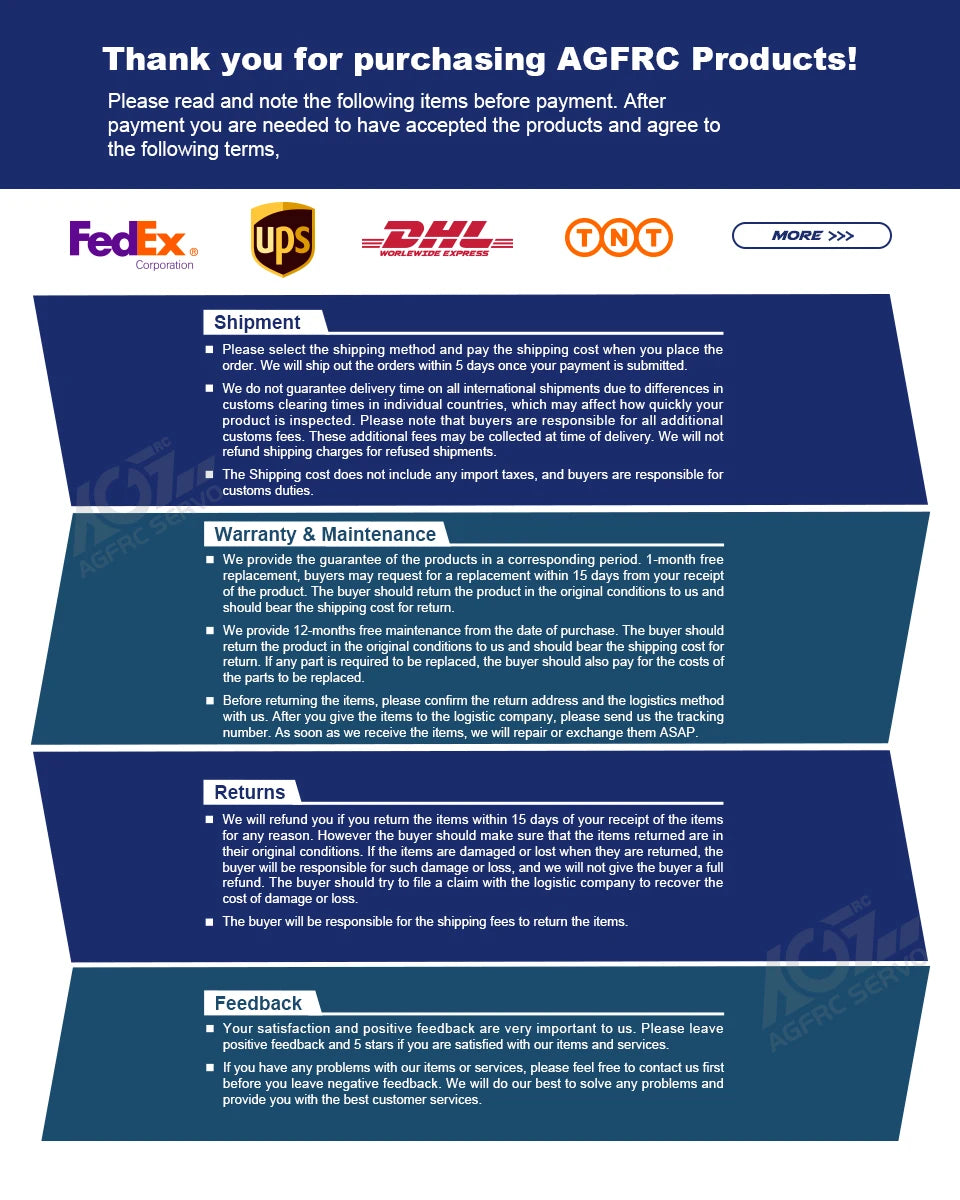 Please note that AGFRC cannot guarantee specific delivery times for international shipments, as customs clearance processes vary by country. As such, buyers are responsible for any additional customs fees that may arise. We offer a one-month warranty replacement policy, which allows buyers to request a replacement within 15 days of receiving the product.