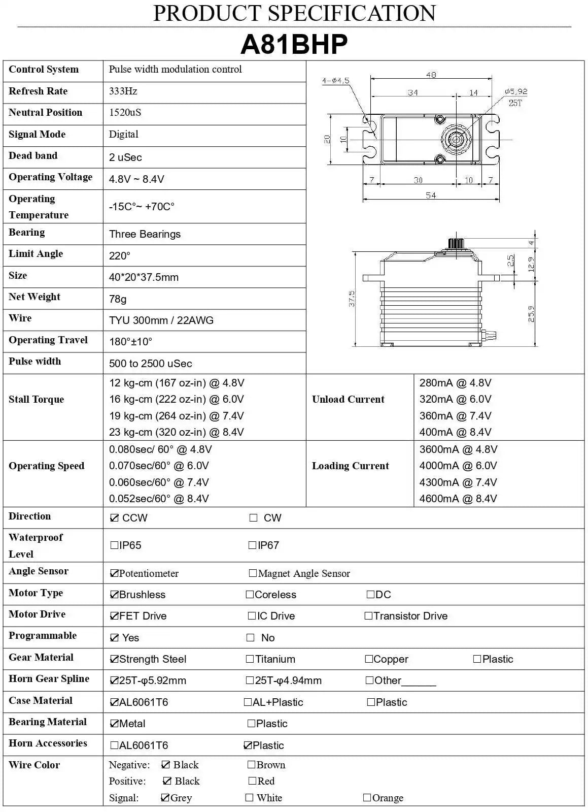 Operating speed: 0.052sec/60° @ 8.4V