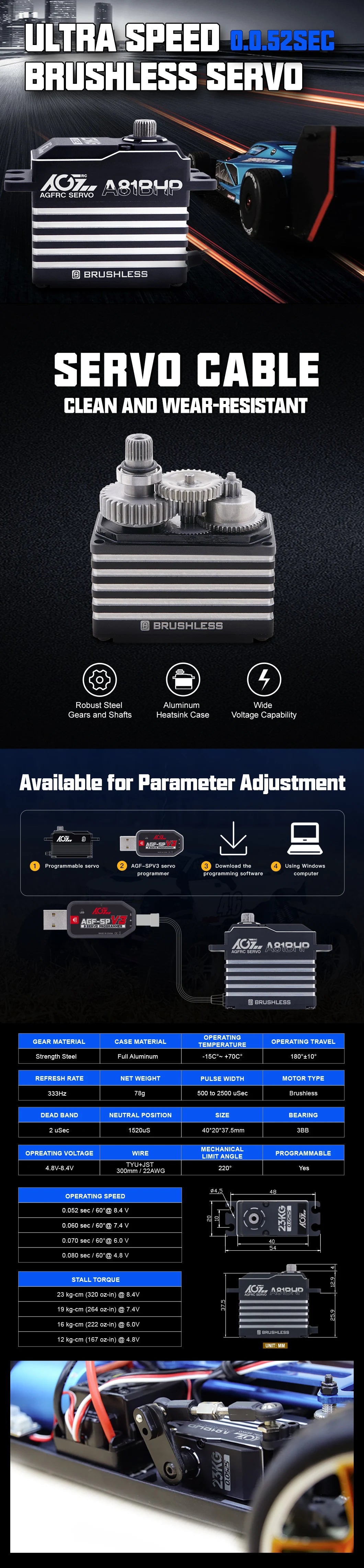 AGFRC A81BHP 78g 23KG 0.052Sec Super Speed Steel Gears HV Brushless Standard Steering Servo For 1/8 RC Truck Car Boat Aircraft