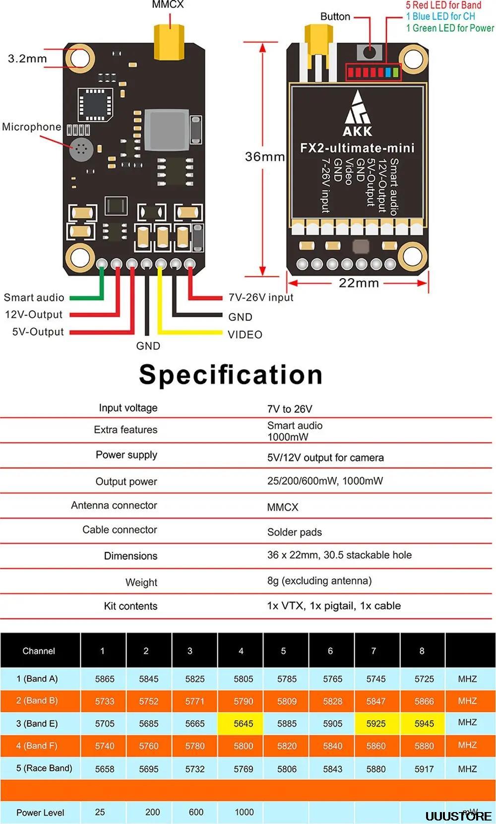 MMCX 5 Red LED for Band Button Blue LED for CH Green LED for Power 3.2mm Microphonel AKK FX2-ultimate-mini 36mm 2838 ZH 3 22mm Smart audio 7V-26V input 12V-output GND SV-Output VIDEO GND Specification Input voltage 7V to 26V Extra features Smart audio 1000mW Power supply SVI12V output for camera Output power 25/200/600mW, 100OmW Antenna