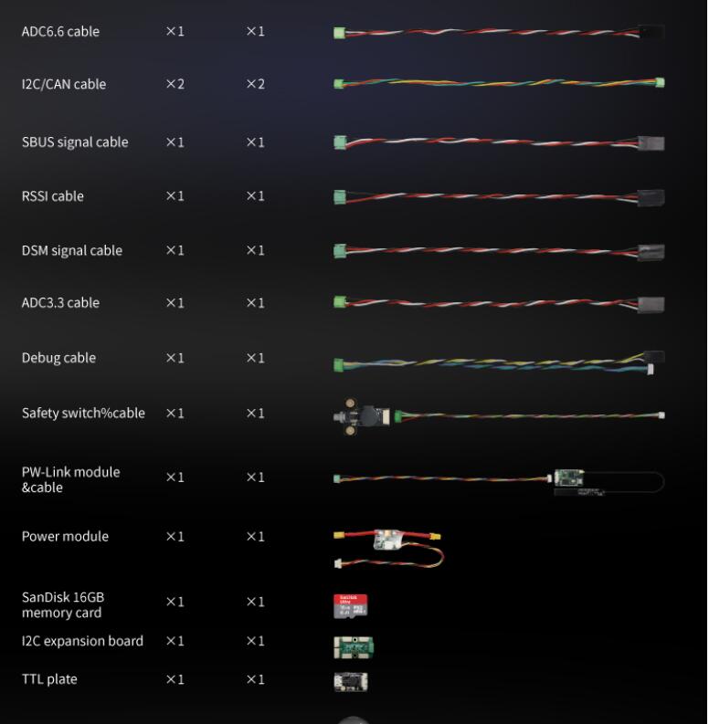 This package includes: an ADC6.6 cable, one I2C/CAN cable, two SBUS signal cables, one RSSI (Received Signal Strength Indication) cable, one DSM (Directional Sensor Module) signal cable, one Debug cable, and one Safety switch cable.