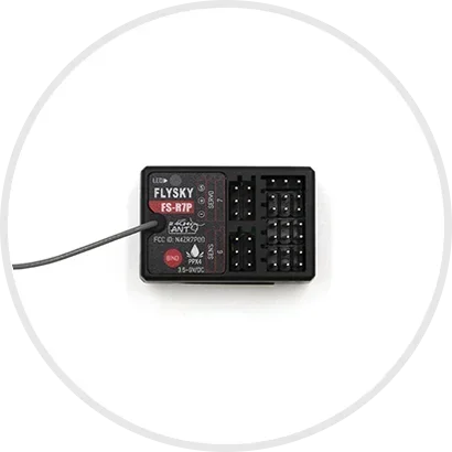 The FlySky FS-R7D receiver is a light group receiver that complies with the ANT protocol. It features an external single antenna design, supporting bidirectional (2-way) transfer-back functionality. Additionally, its compact design makes it adaptable to various vehicle models.