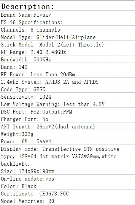 GFSK Sensitivity: 1024 Low Voltage_Warning: less than 4.2V DSC Port: PS2 ; Output:PPM Charger Port No ANT length: 26nn*2 (dual antenna) Weight: 392g Power: 6V 1.