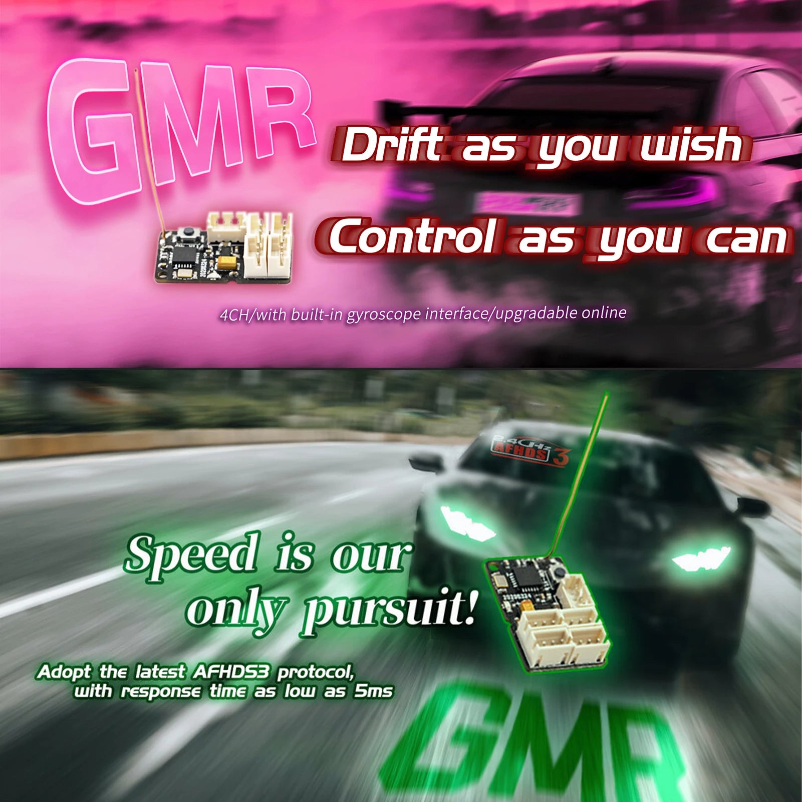 GMr is a 4-channel micro/mini car receiver, using AFHDS 3 (third-generation automatic frequency hopping digital system), single external antenna bidirectional transmission, micro size, and reserved gyro interface. The GMR receiver is compatible with RC racing cars and drifting mini cars.