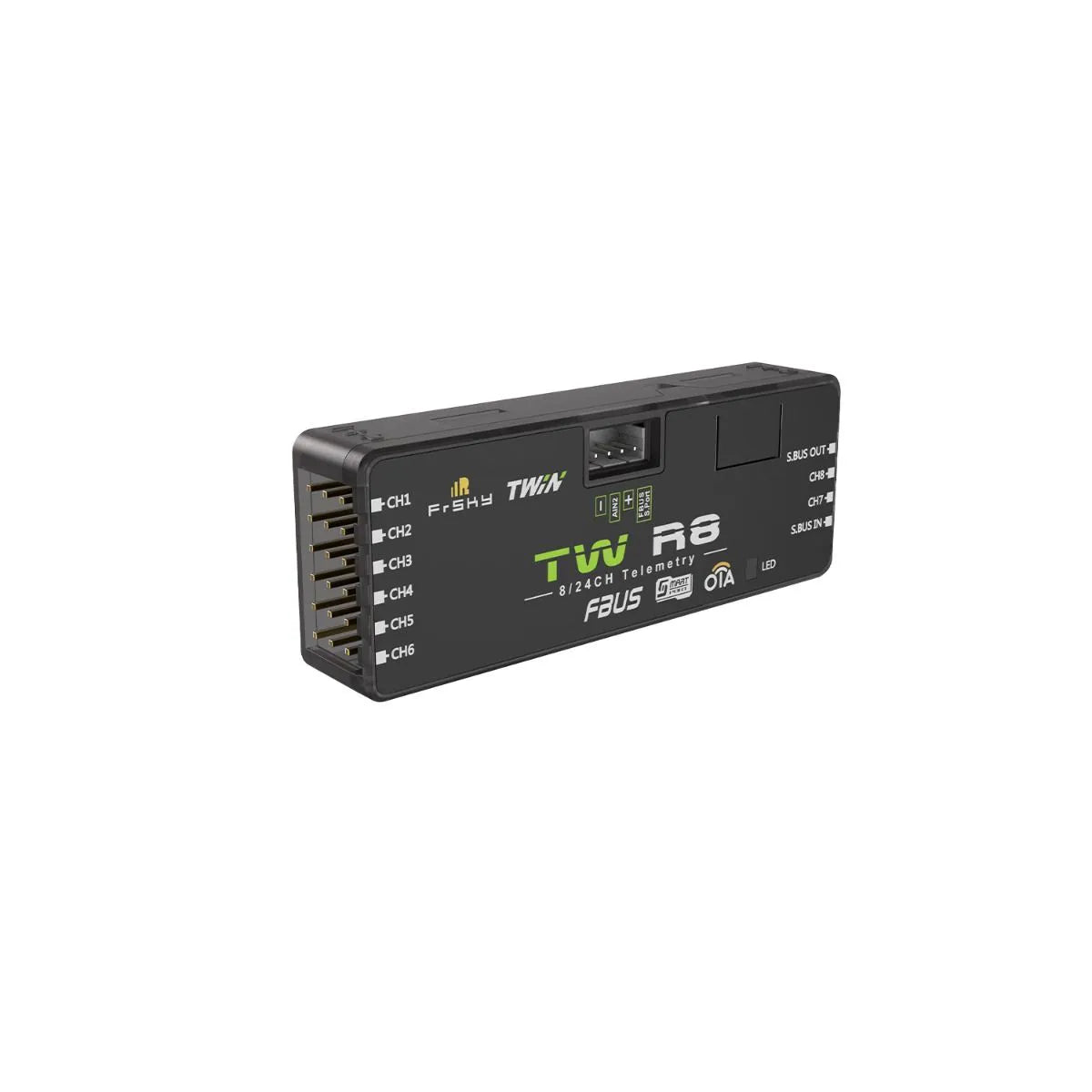 TWIN series TW R8 receiver features a new stable TW protocol that benefits from simultaneously integrating dual active 2.4G frequency bands. The TW active-active protocol is different from the general active-standby redundancy solutions (where one receiver takes over signal control only when the other is in Failsafe mode), with the TW protocol, dual 2.4G frequency bands are active on the TW series receiver at the same time.