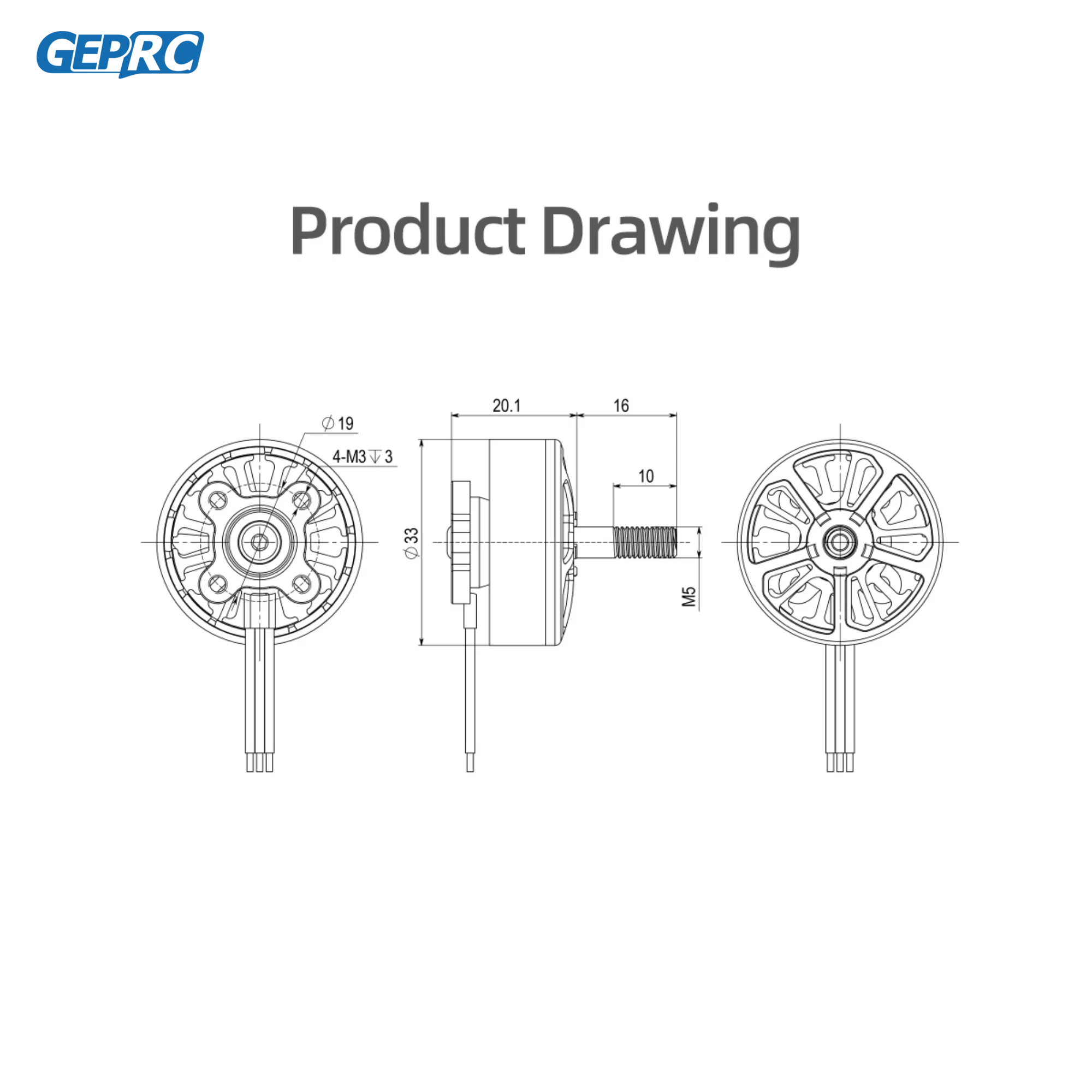 Specifications GEPRC EM2807 KV 1350KV Max Watt 1080w Peak current 47A Interphase resistance 45mn Propeller 6-8inch Propeller Magnet N52H Bearing type NSK/NMB Configuration 12N14P Dimension 033mmx2o.Imm Shaft Diameter p5mmShaft Protruding Length 16mm Mounting holes 19mmx19mm Lead 260mm/18AWG ESC 50A-60A Input Volts 25.2v (6