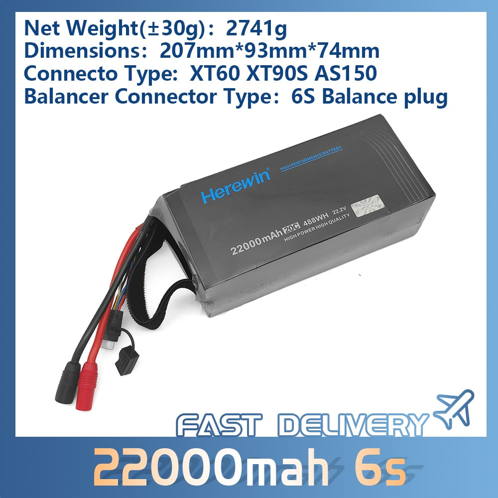 Высококачественный литий-ионный полимерный аккумулятор Herewin с напряжением 22,2 В и впечатляющей емкостью 22000 мАч обеспечивает отличную производительность и высокую выходную мощность.
