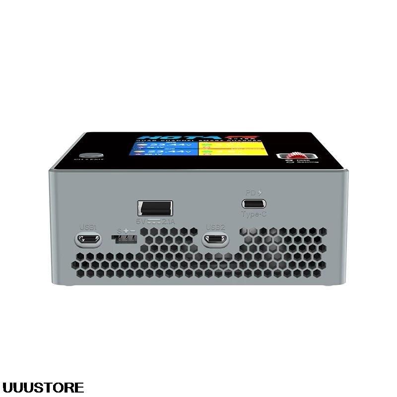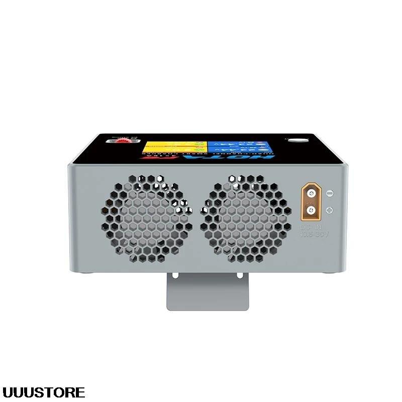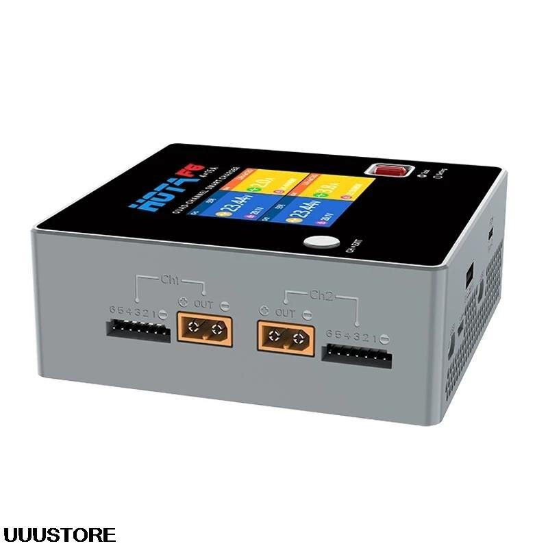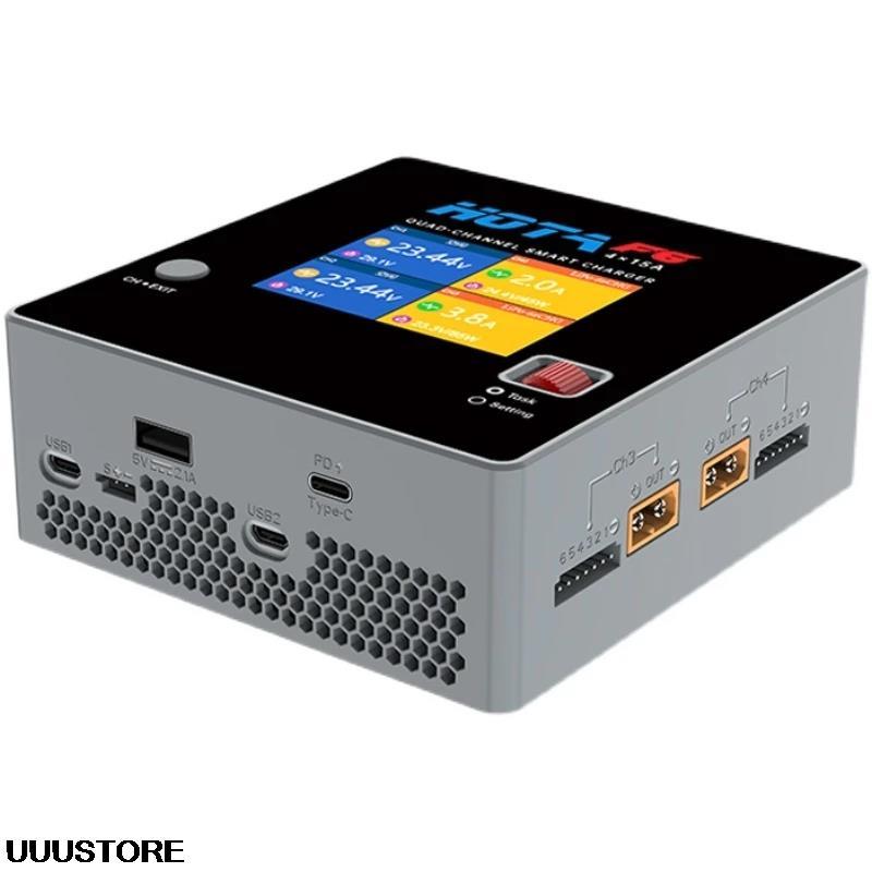 The HOTA F6 charger features a 4-channel balance smart charging system that can charge multiple battery packs simultaneously, including Lipo, LiFe, NiMH/NiCD drone batteries. The charger has two dual ports for efficient charging.