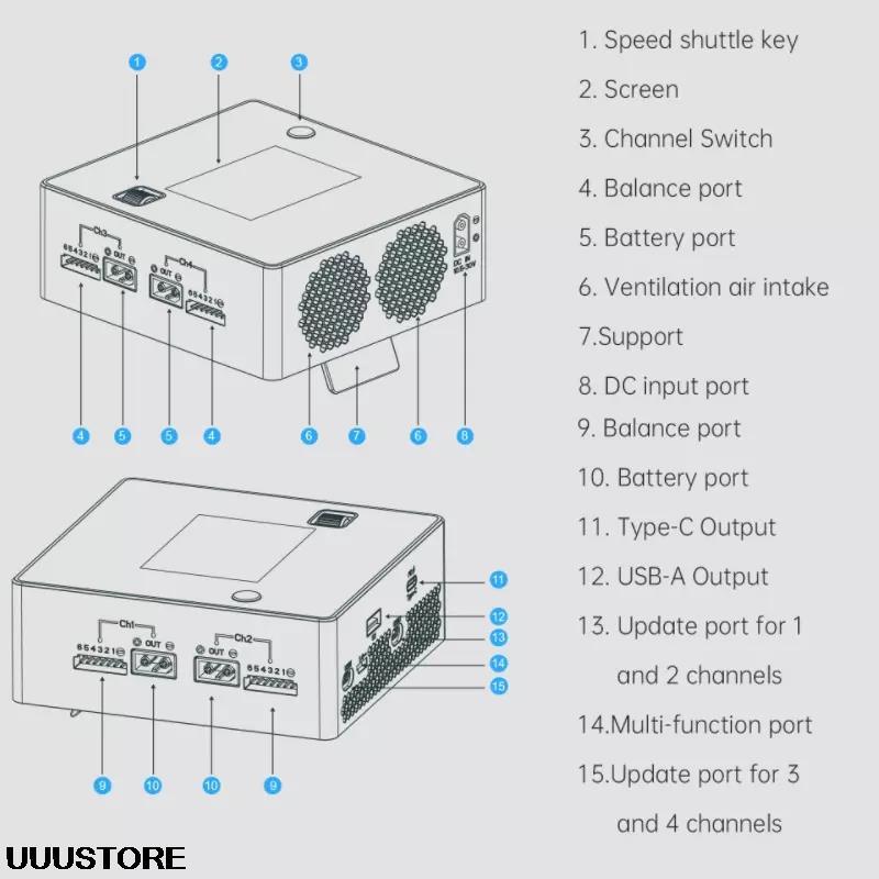 - Charge current: 0.1~15A×4