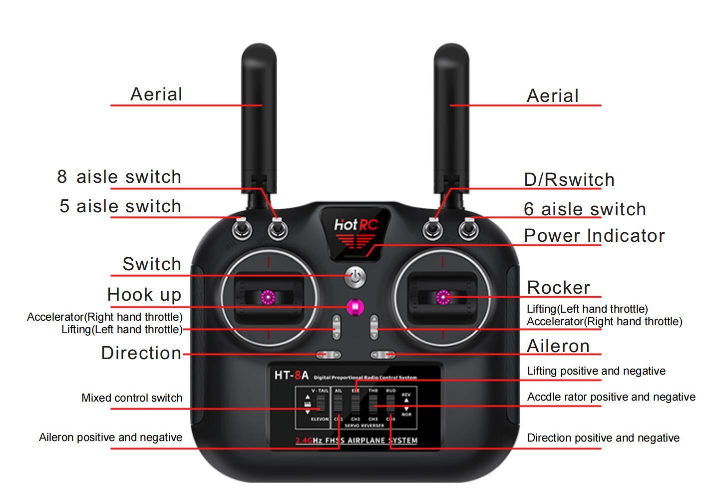 Aerial 8 aisle switch DIRswitch 5 aisle switch 6 aisle switch hotRC Power Indicator Switch Hook up Rocker Lifting(Left hand throttle) Accelerator(Right hand throttle).