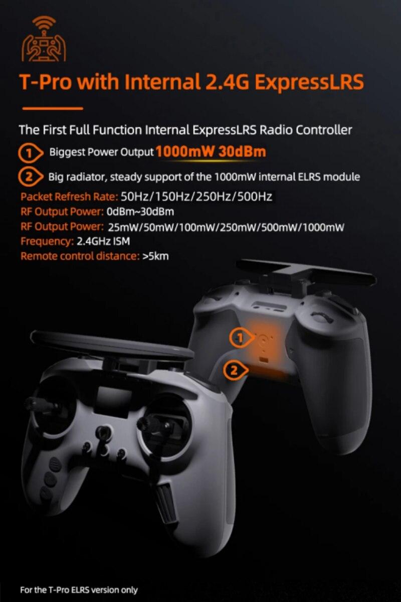 T-PRO-ELRS-SE is built-in 100mw, with a control distance of 7km and a return transmission distance of 3km.