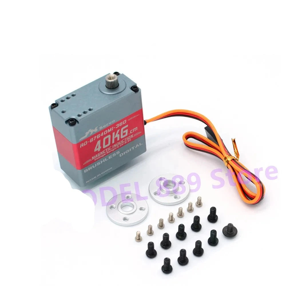 JX Servo RD-B7640MI-360: A brushless servo with magnetic induction, featuring a full CNC aluminum hull and a mechanical arm for robotics applications. It has an operating voltage of 8.4V, a weight capacity of 40kg, and a rotation speed of 0.11 seconds per 60 degrees (360-degree range).