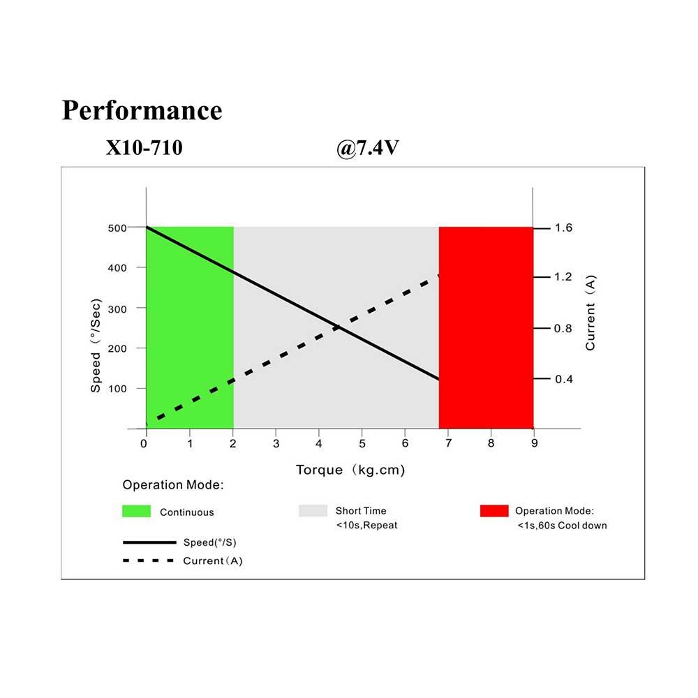 KST X10-710 Digital Metal Gear Glider Robot UAV Servo Motor: Operating Voltage – 4.8V to 8.4V; Torque (kg.cm) at various voltages: 6.2 kg.cm @ 7.5V, 6.8 kg.cm @ 7.4V, and 10.8 kg.cm @ 8.4V; Response Time: 0.14 seconds @ 6.0V, 0.16 seconds @ 4.8V.