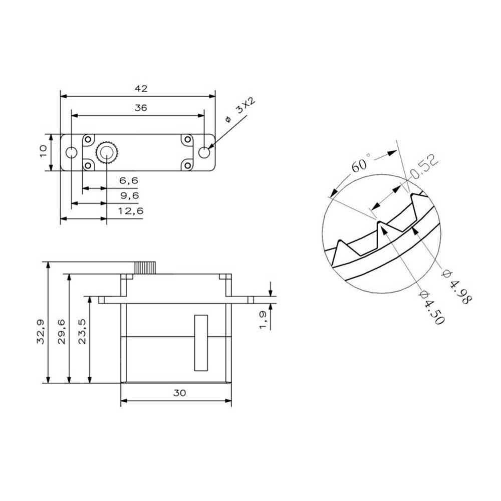 Operation Voltage(rated): DC7.4V Operation Voltage Range: DC4.8-8.4V Torque 4.5kg.cm @4.8V 5.5kg.cm @6.0V 6.8kg.cm @7.4V 7.5kg.cm @8.4V Speed: 0.16sec/60 @4.8V 0.14sec/60 @6.0V 0.12sec/60 @7.4V 0.10sec/60 @8.4V Size: 30*10*30mm Weight: 23g Motor: Coreless