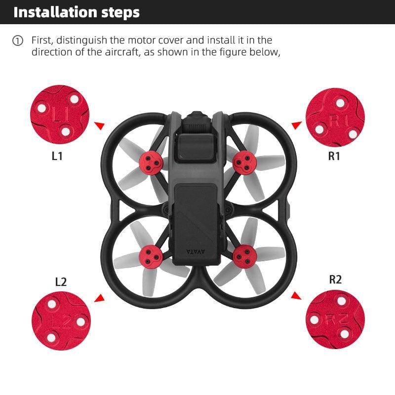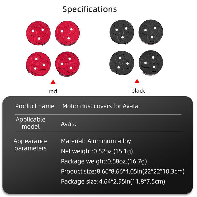 Specifications red black Product name Motor dust covers for Avata Applicable model . Material: Aluminum alloy parameters Net weight:0.5802 (16.7g) Package size:4.64*2.95in(11.8*7.Scm)