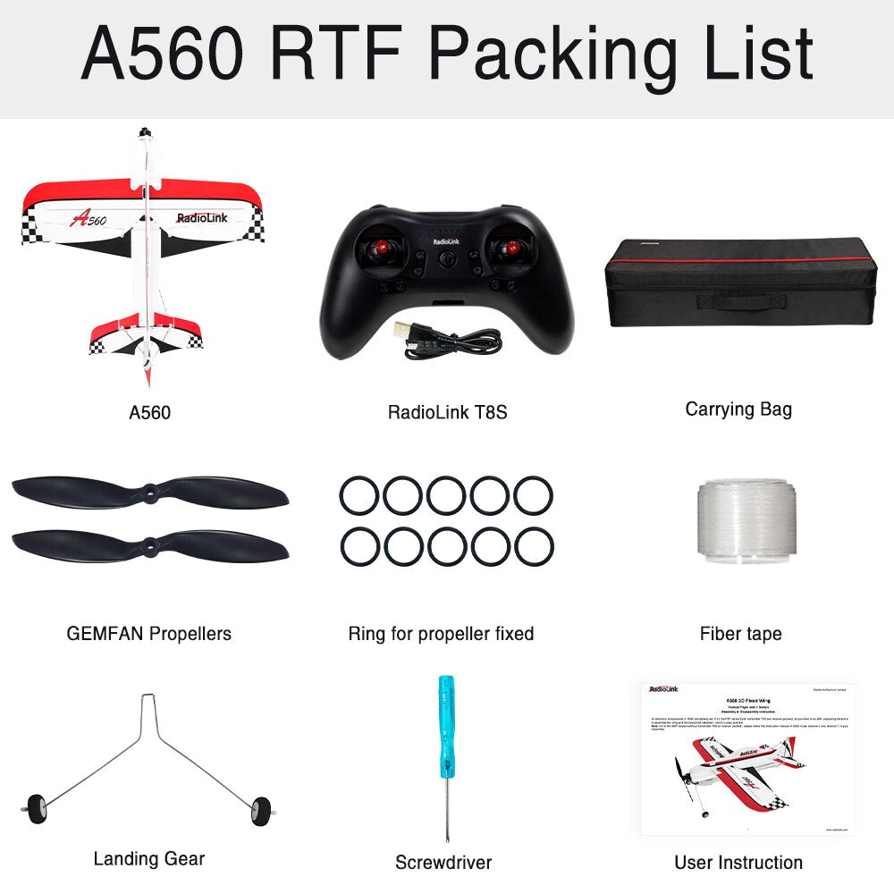 Radiolink A560 Ready-to-Fly (RTF) Packing List includes: RadoLink Y1.0, R8XM, BUB/PPH, BuA LED, SEPFM-Radolink, 3.6V IDG, 5V+, Gyro Assist System, and a comprehensive instruction manual.