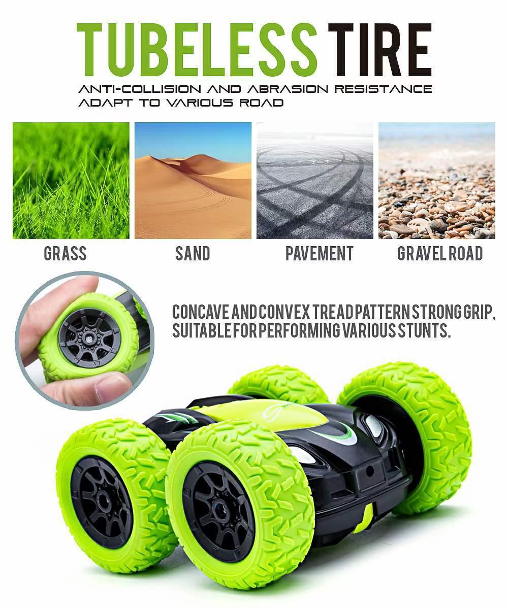 2.Anti-slip Tires: This double-sided stunt car is designed with unique durable tires which are anti-slip and more flexible, adopting to any terrain such as sand, grass, rocks, muddy roads and so on.