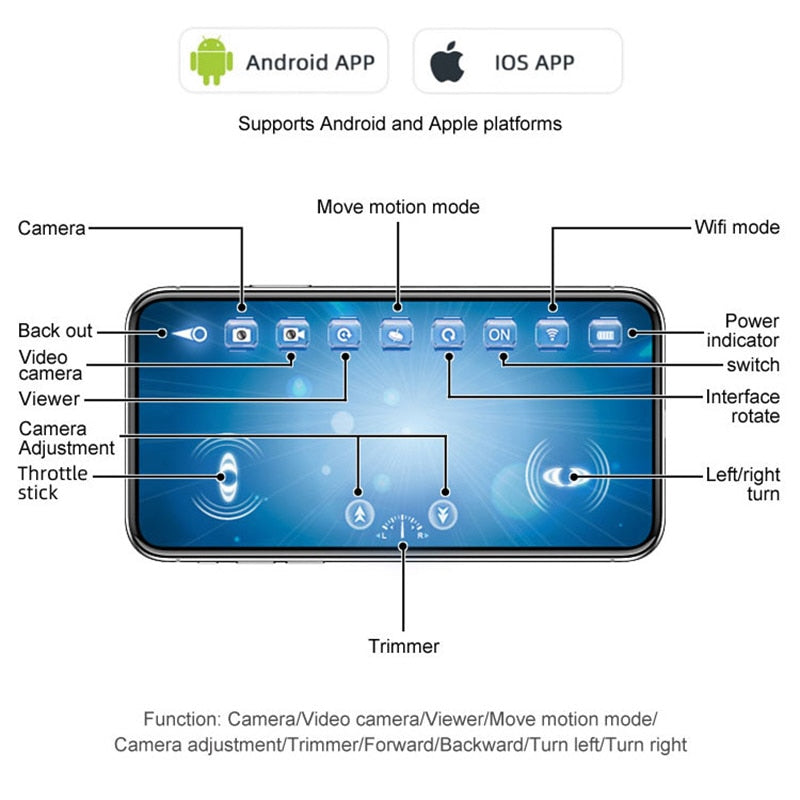 Using the included APP, you can download and connect to your smartphone via WiFi, enabling remote control of the camera-equipped vehicle in RC mode.