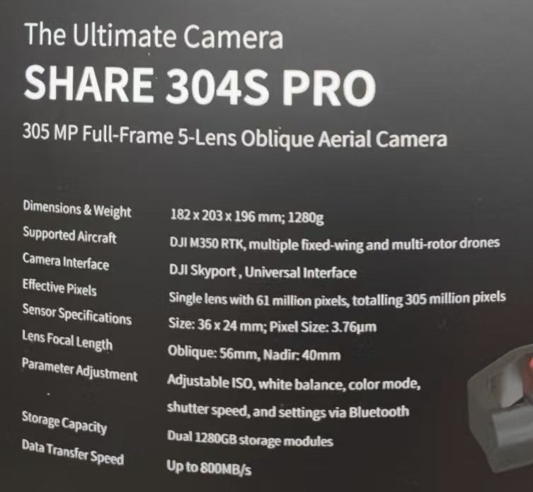 SHARE 304S Pro features a 305MP full-frame oblique camera with five lenses, ideal for 3D mapping and aerial photography applications.