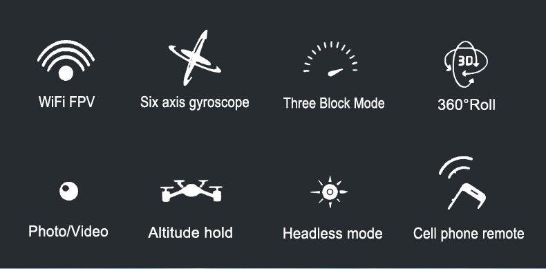 Functions: Sideward flight, turn left/right, up/down, forward/backward, high/low speed, 3D rollover, 0.3MP camera, Wifi FPV, gravity sense control, headless mode, one key return, altitude hold