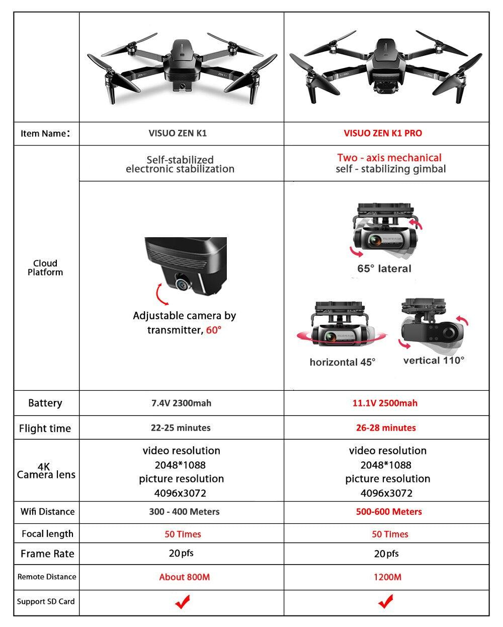 VISUO ZEN K1 PRO Two axis mechanical electronic Sonictabilzeation self – stabilizing gimbal Cloud Platform 650 lateral Adjustable camera by transmitter, 609 horizontal 450 vertical 1109 Battery 7.4V 2300mah 11.1V 2500mam Flight time 22-25 minutes 26-28 minutes video resolution video resolution 4K